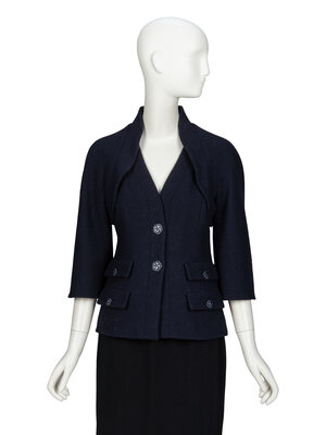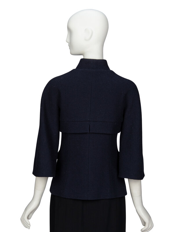 Fitted jacket in navy wool bouclé tweed. Features incorporated bolero with stand collar and V neckline. Elbow-length flared sleeves. Slightly waisted bodice. Four welt pockets with buttoned flaps at front. Single breasted; two button closures at front. Blue Gripoix buttons throughout. Metal chain at interior hem. Fully lined.