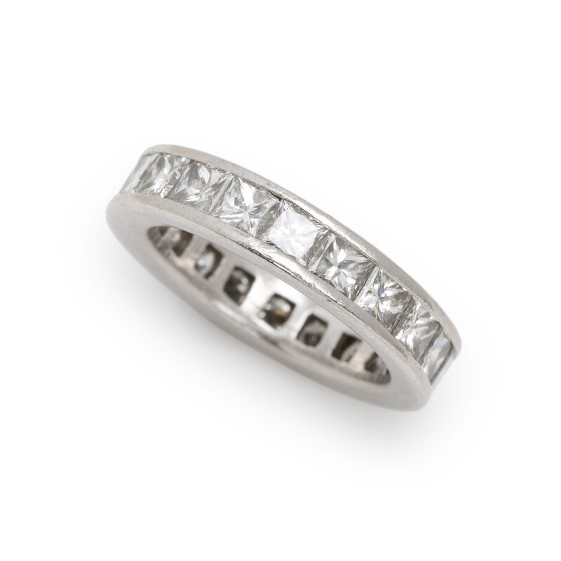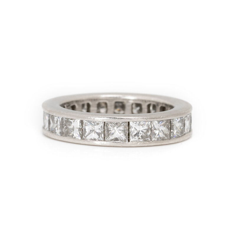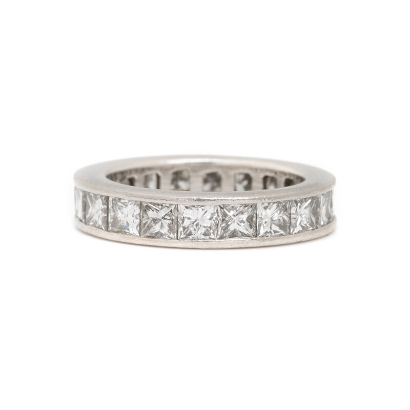 Channel-set princess cut diamonds weighing approximately 2.15 carats total. Platinum. Ring size 4 1/4.