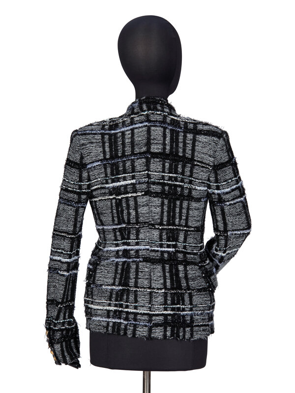 Tailored blazer in a black, white and grey knit plaid tweed. Notched & peaked lapels. Padding at shoulders. Full-length sleeves with working button closures at cuffs. Two welt pockets with flaps at front; one upper chest welt pocket. Double breasted; one exterior button closure at front with gold-tone metal buttons throughout. Unlined.