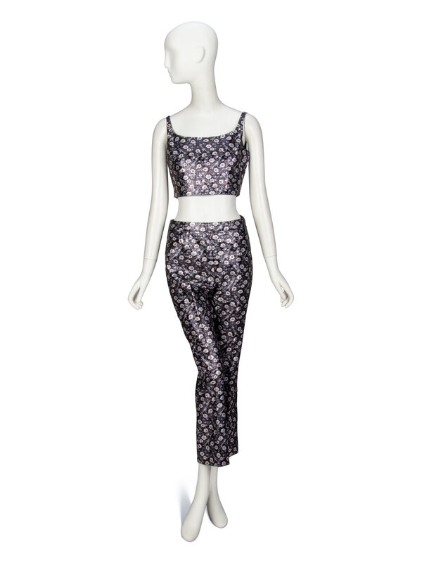 Cropped bustier top in a silvery-metallic floral brocade. Slim straps. Scoop neckline. Zipper closure at side bodice. Fully lined.