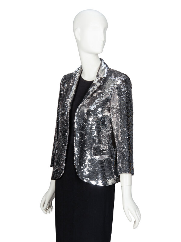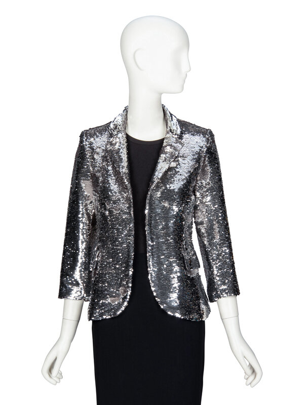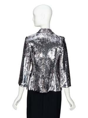Tailored open-front jacket in all-over silver flip sequin fabric. Short notched lapels. Padding at shoulders. Three-quarter-length sleeves. Two welt pockets with flaps at front. No closures. Fully lined.