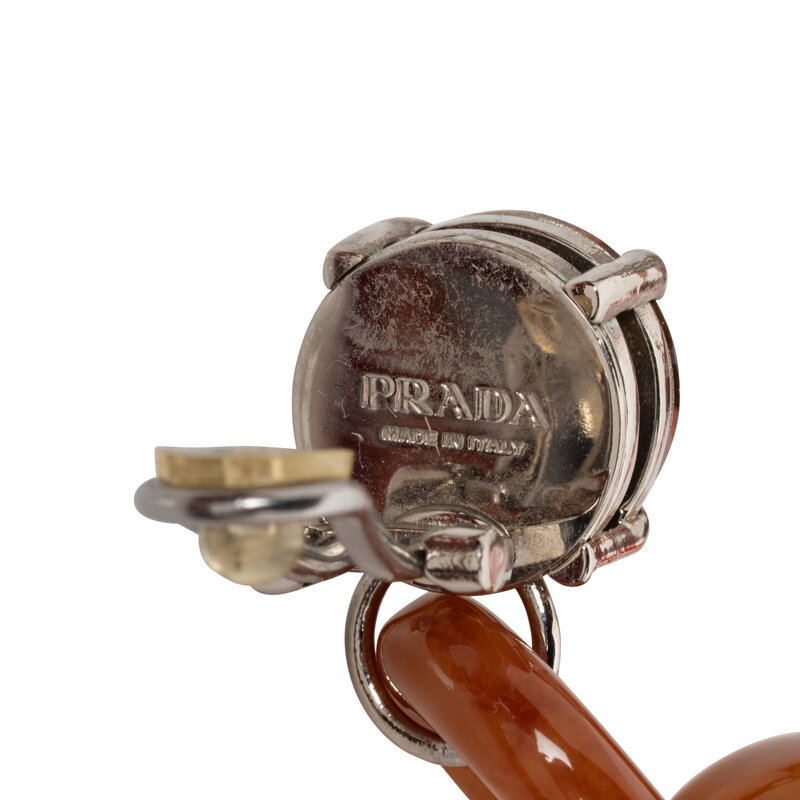 Pair of ear clips in amber-colored composite and silver-tone metal with a amber-colored rhinestone setting. Standard clip backing. Stamped "PRADA / Made in Italy" at backs.