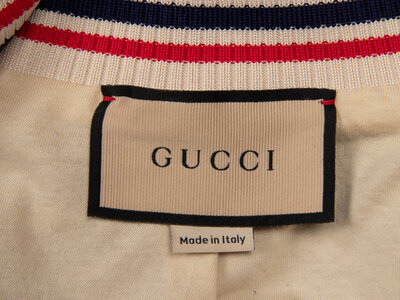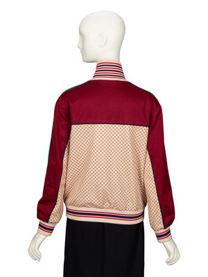 Track jacket in burgundy and beige monogram-print polyester/cotton-blend pique knit. Striped ribbed knit trim at collar, cuffs, and hem. Convertible stand/spread collar. Full-length sleeves with a red & green stripe appliqué. Two zipper pockets at front. Zipper closure at front. Fully lined.