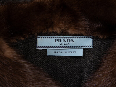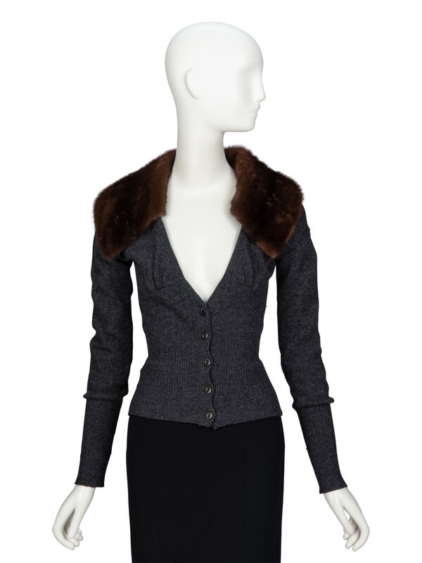 Fitted cardigan in grey wool/cashmere-blend knit; with a large brown mink fur collar. Deep V neckline. Fitted at waist. Full-length sleeves. Five button closures at front. Unlined.