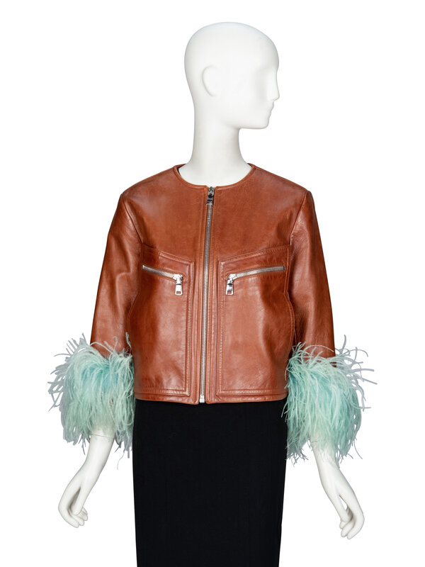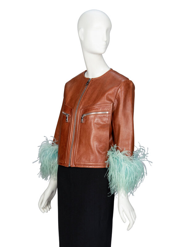 Slightly cropped jacket in brown lambskin leather. Round collarless neckline. Three-quarter-length set-in sleeves with teal ostrich feathers at cuffs. Two slip pockets at front; two zipper pockets at chest. Zipper closure at front. Fully lined.