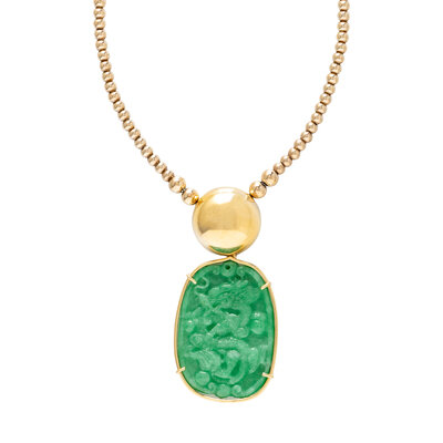 Carved jade measuring approximately 43.00 x 31.00 mm. 14 karat yellow gold. 15 3/4 inches long.