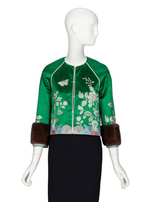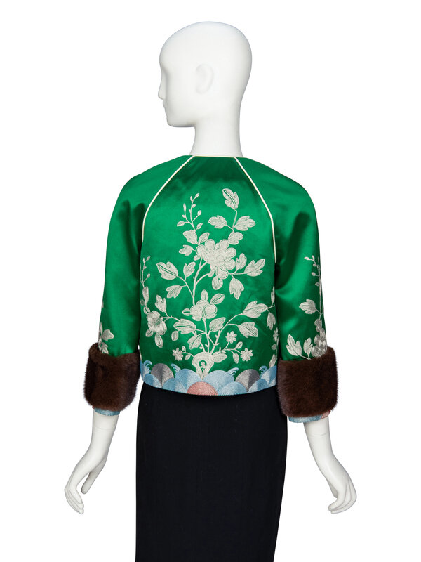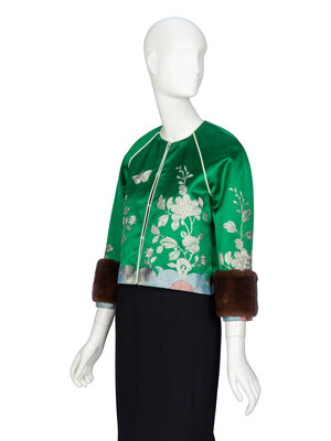 Jacket in green silk satin with metallic floral embroidery and brown mink fur-trimmed cuffs. Cream braided piping throughout. Slightly cropped length. Round collarless neckline. Three-quarter-length raglan sleeves. Five hook-and-eye closures at front. Fully lined.