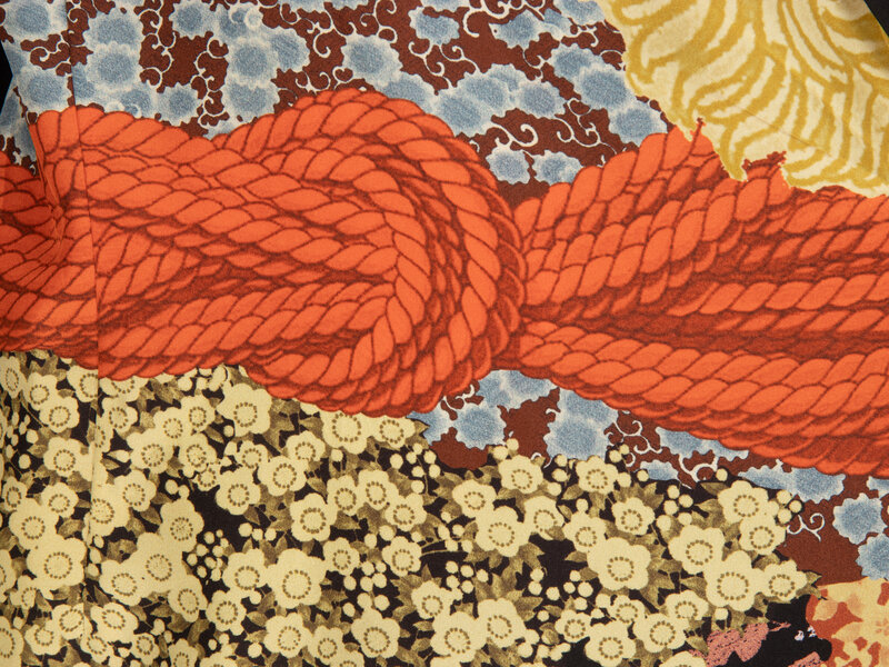 Robe in black/multicolor print silk habotai. Shawl collar. Full-length sleeves. Asymmetric wrap front; tie closures at interior & exterior side seams. Unlined.