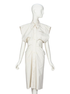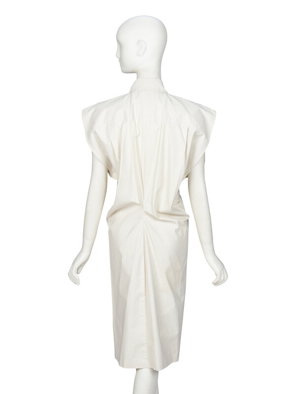 Knee-length sleeveless shirtdress in bone grey stretch-blend cotton broadcloth. Pointed collar. Wide, extended shoulders & deep cut armholes. Small slit at upper chest to an interior slip pocket. Slightly fitted at waist and hips. Snap button closures at front. Unlined.