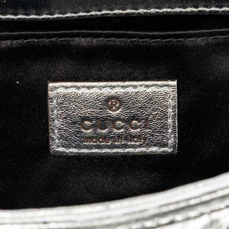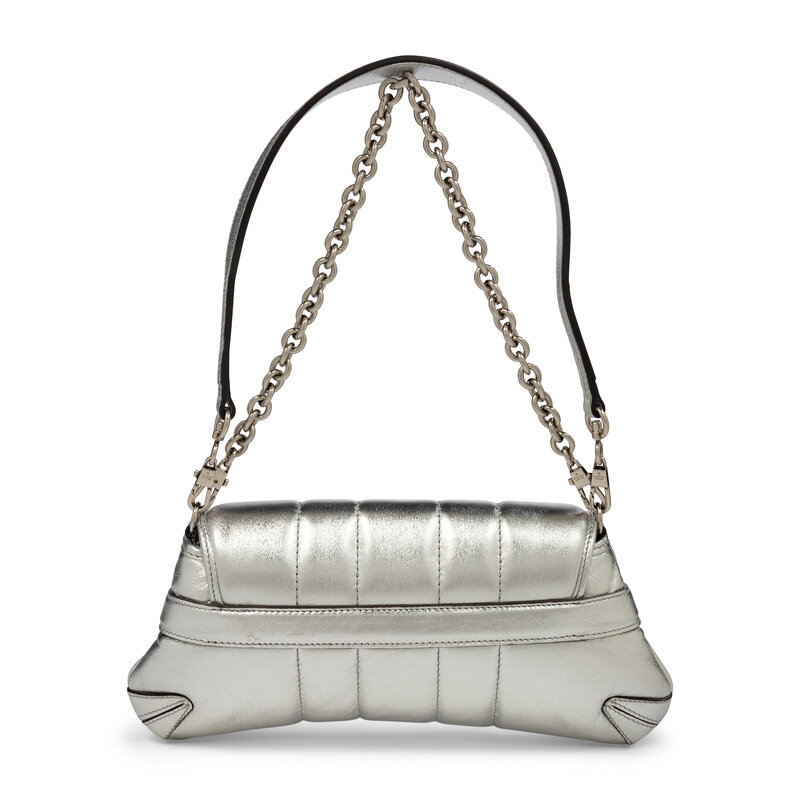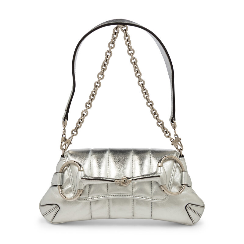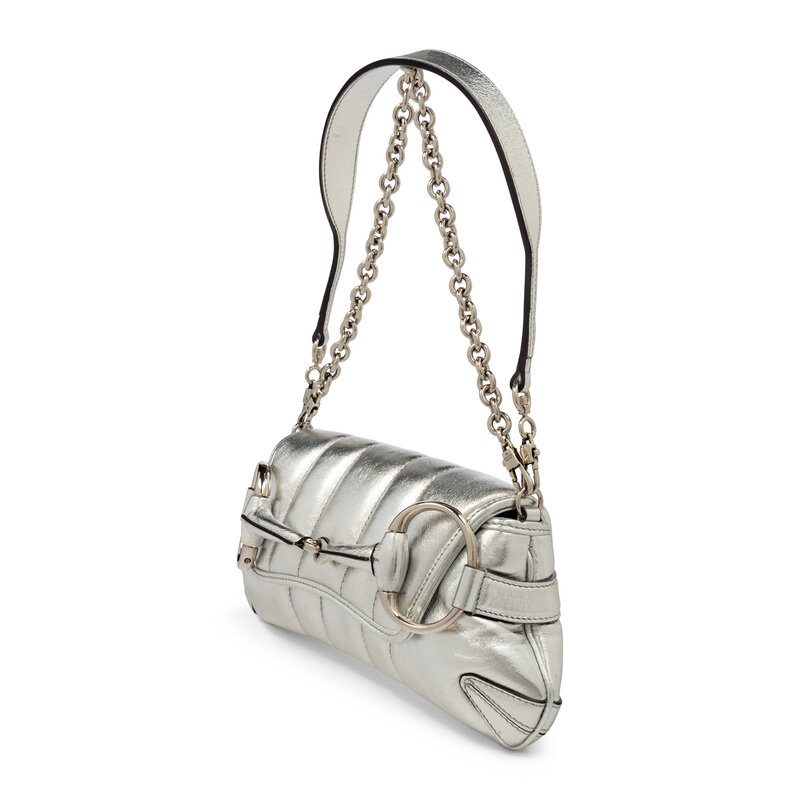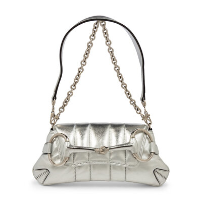Horsebit bag in metallic silver quilted leather with an oversize metal horsebit detail. Magnetic snap closure, removable metal chain strap, and removable flat leather strap.