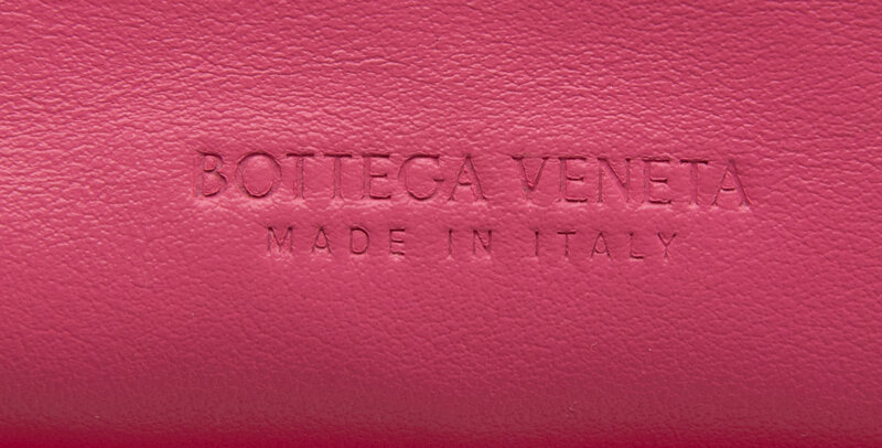 Wallet pink intrecciato leather. Silver-tone hardware and snap closure.