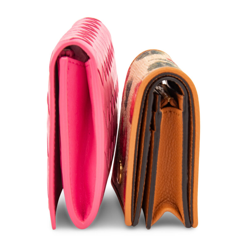 Wallet in cherry-motif jacquard and tan grained leather. Gold-tone hardware and snap closure.