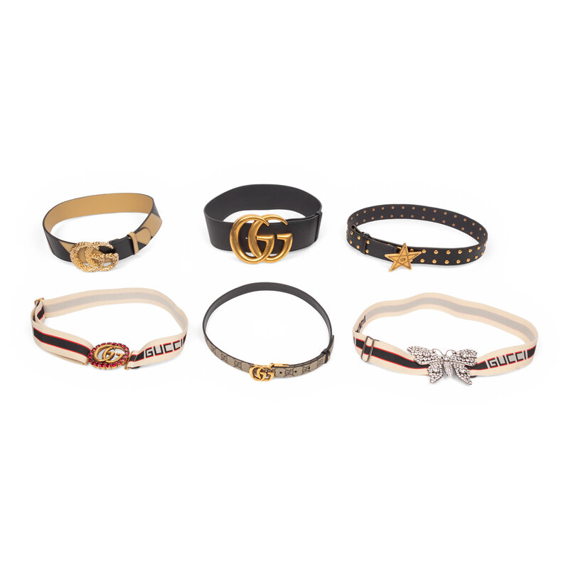 Studded belt in black leather with aged gold-tone hardware. Studs throughout and GG star-shaped belt.