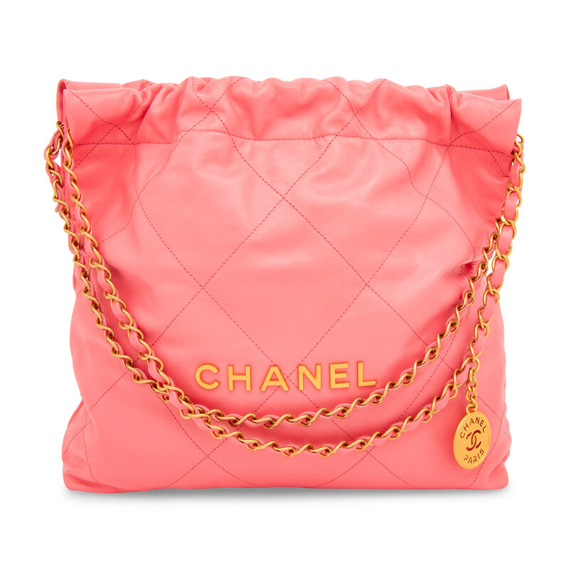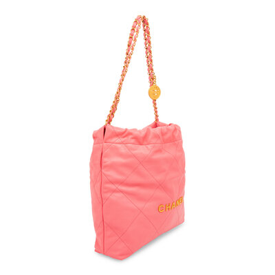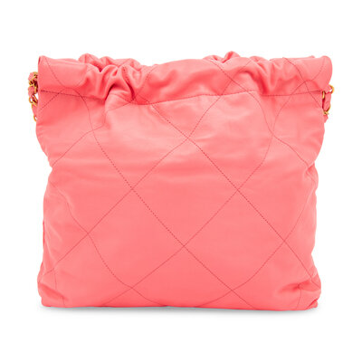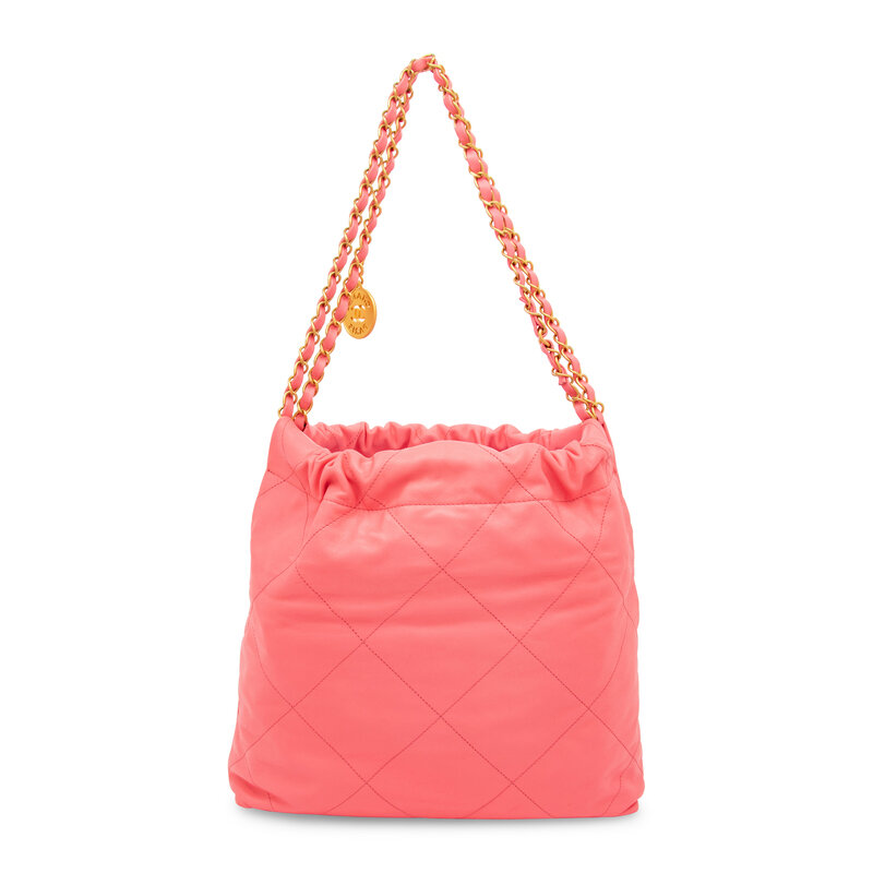 Small 22 tote bag in diamond-topstitched pink leather with brushed gold-tone hardware. Magnetic snap closure and interwoven leather-metal chain straps.