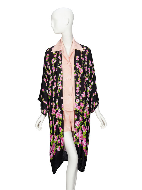 Open-front kimono-style robe in floral-print black viscose/silk-blend jacquard. Three-quarter-length kimono sleeves. Unlined.