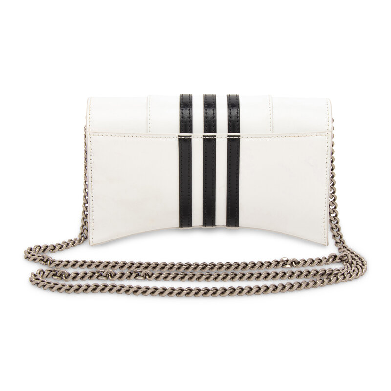 Limited edition wallet-on-chain in smooth white leather with three black leather stripe appliques. Magnetic snap closure and removable metal chain strap.