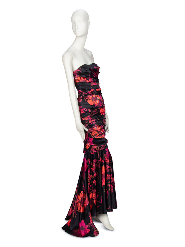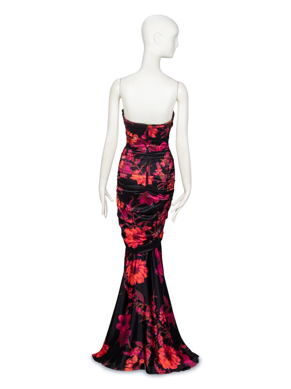 Strapless fitted evening gown in a black & multicolor floral-print stretch-blend silk charmeuse. Sweetheart neckline. Structured bodice with boning throughout and wired bra cups. Draping/ruching throughout bodice and upper skirt. Flared skirt starting at about knee height with slight train at back. Zipper closure at back bodice. Fully lined.