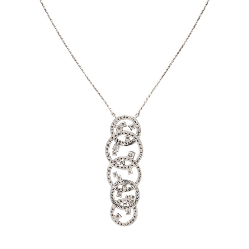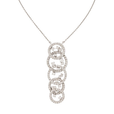 Round diamonds weighing approximately 2.10 carats total. 14 karat white gold. Necklace: 17 3/4 inches long. Drop: 2 1/8 inches long.