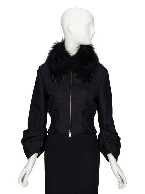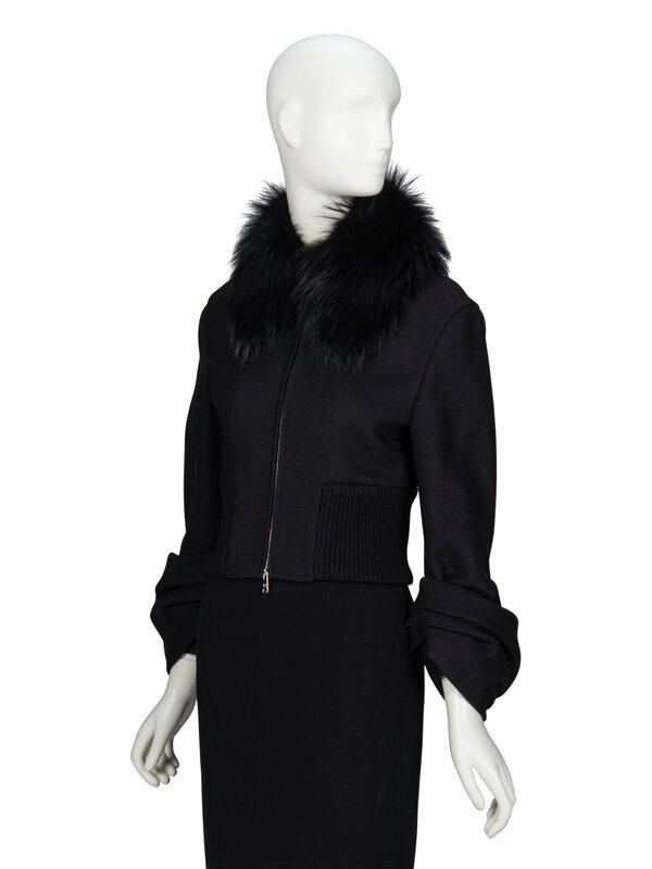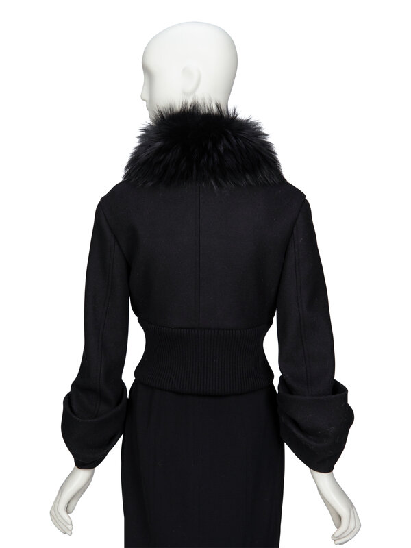 Cropped jacket in black felted wool-blend twill with black wool ribbing trim at the hem. Black-dyed fox fur collar. Full-length set-in sleeves with large draped cuffs. Zipper closure at front. Fully lined.