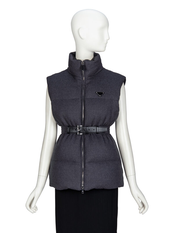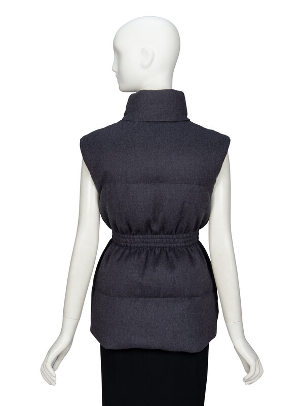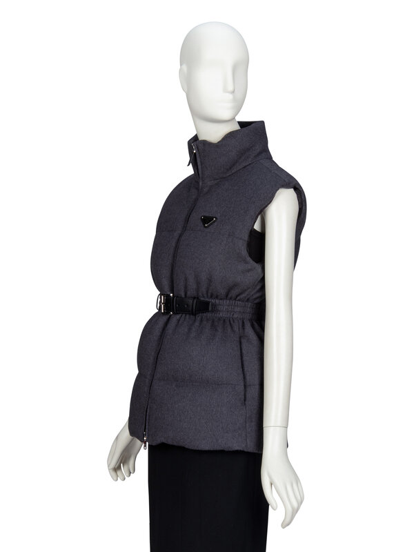 Belted puffer vest in dark grey virgin wool suiting with quilting throughout; filled with goose down. Stand collar. Elasticated cinched waist with partial black leather belt closure at front. Two in-seam slip pockets at side seams; one interior breast pocket. Double-ended zipper closure at front. Fully lined.