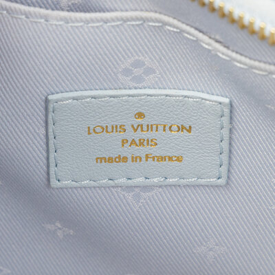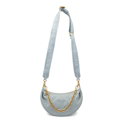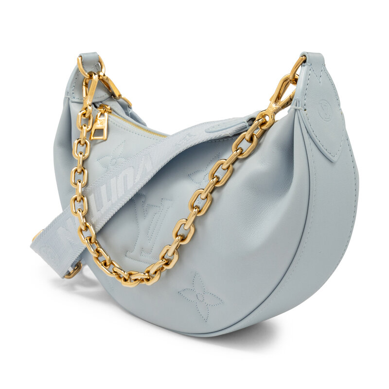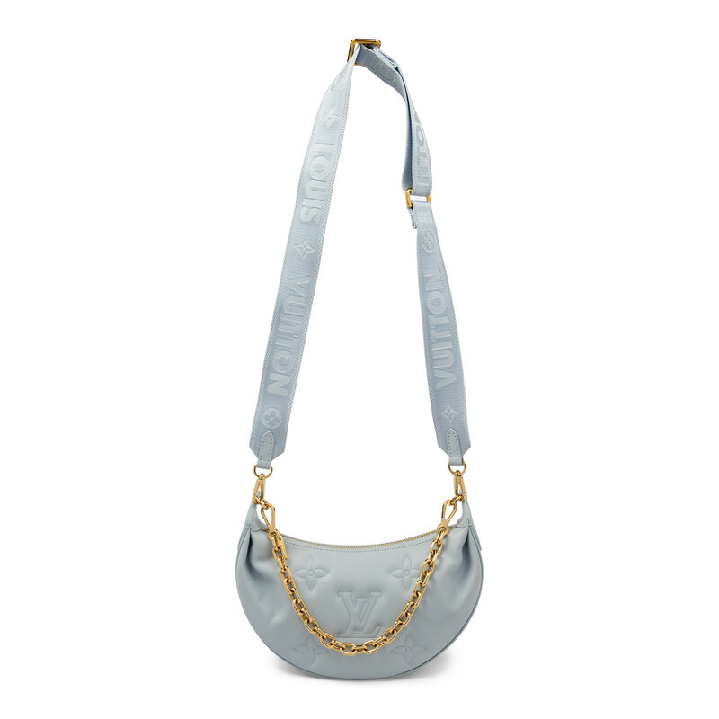 Over the Moon bag in powder blue monogram-quilted leather. Zipper closure, removable metal chain handle, removable jacquard strap.