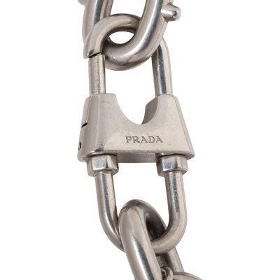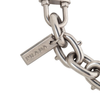 Chain necklace in aged-silver tone metal. Spring clasp closure. Stamped "PRADA / Made in Italy" at hanging tag.