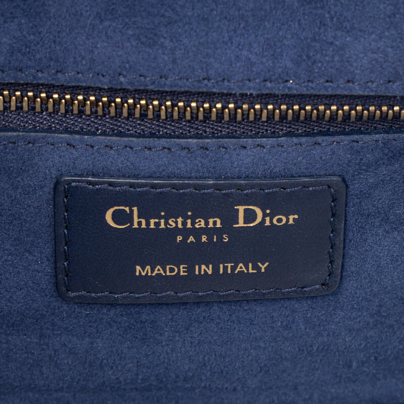 DiorAddict flap bag in cannage-quilted navy lambskin leather. Push-lock clasp closure and metal chain strap.