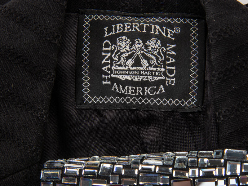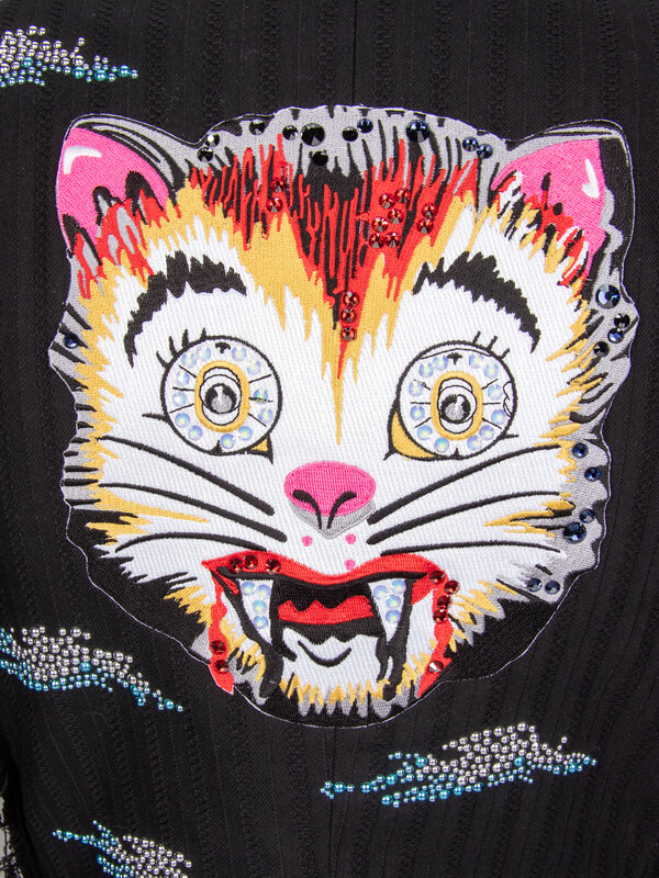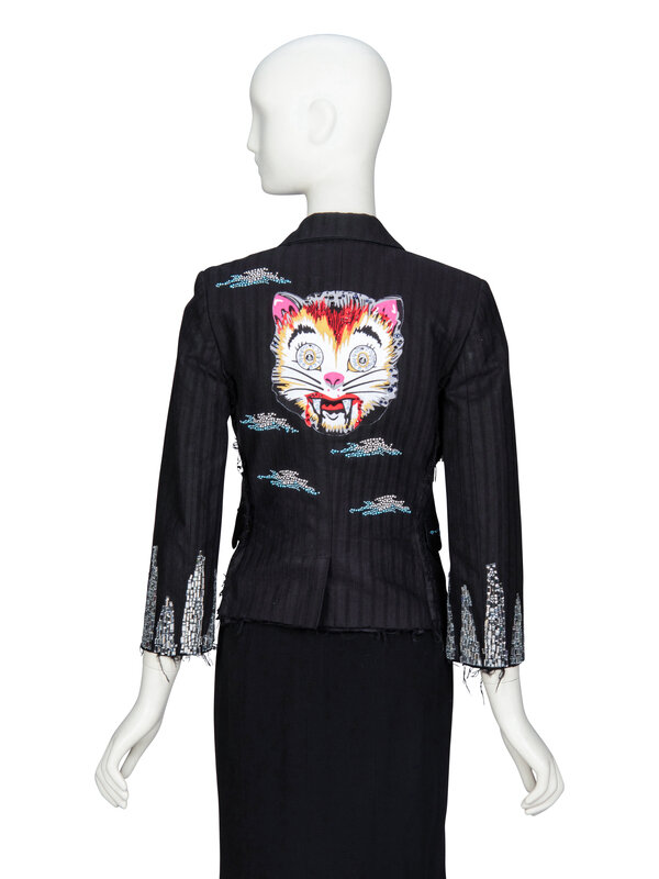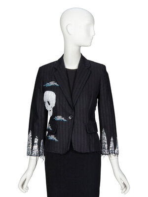 Tailored lightly distressed jacket in black jacquard suiting. Black satin piping trim throughout. Notched lapels. Light padding at shoulders. Three-quarter-length sleeves with rhinestone embellishments at hems. Two welt pockets with flaps at front. Embroidered patched and rhinestone & embellishments throughout. Raw frayed edges throughout. Single breasted; one button closure at front. Fully lined.