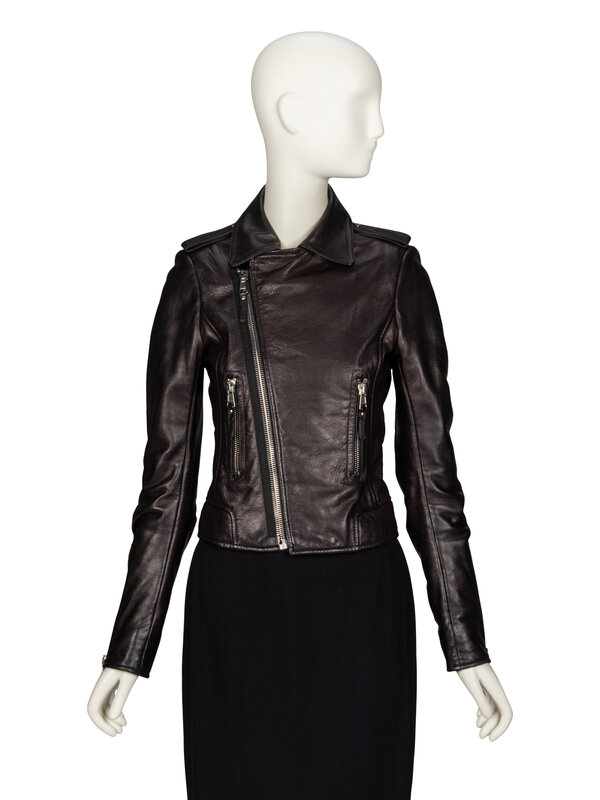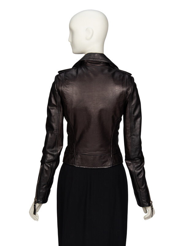Moto jacket in black lambskin leather. Convertible collar/notched lapels. Light padding and epaulettes and shoulders. Full-length sleeves with zipper closures at cuffs. Two zipper pockets at front. Asymmetric zipper closure at front. Fully lined.