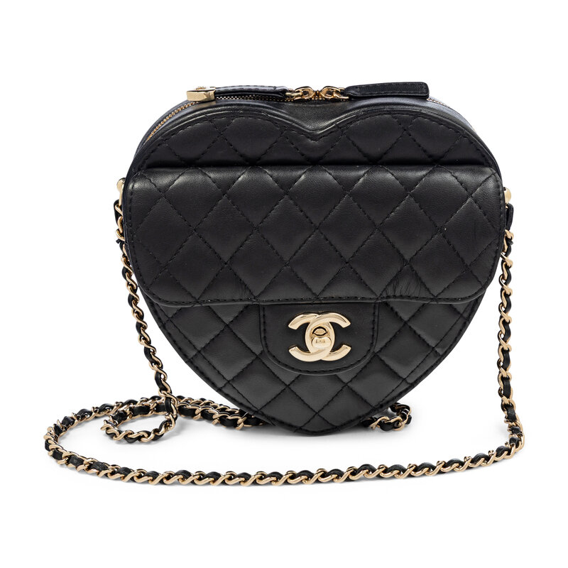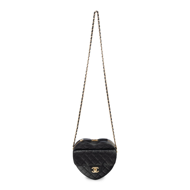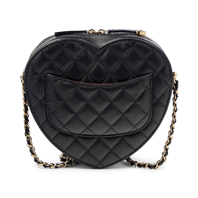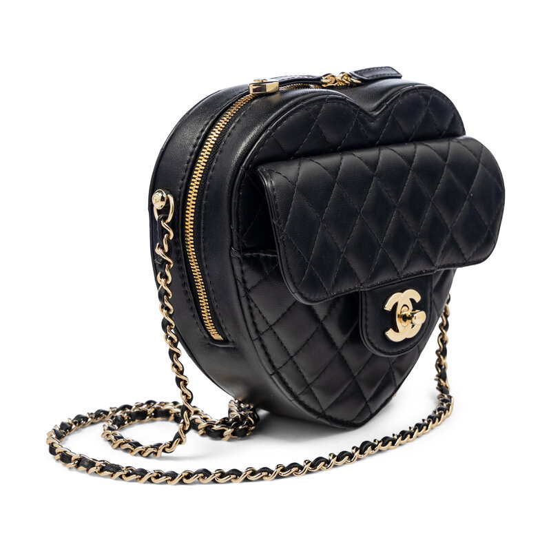Love Heart shoulder bag in quilted black lambskin leather with gold-tone hardware. Double zipper closure and interwoven leather-metal chain strap. Exterior slip pocket at front with CC turn-lock closure to flap.