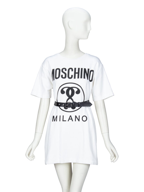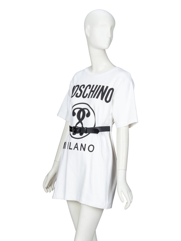 Belted T-shirt minidress in off-white stretch cotton jersey; with black "MOSCHINO / MILANO" and double question mark print at front. Round neckline with ribbed knit collar. Short sleeves. Removable black leather belt at waist; belt channel at back. Unlined.