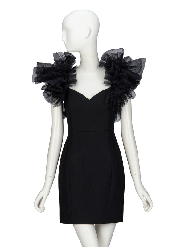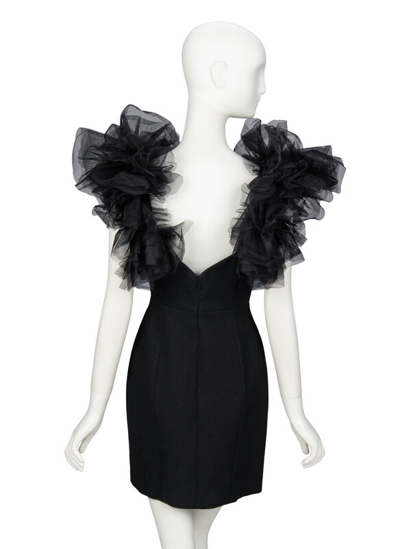Minidress in black wool crêpe; features large layered tulle ruffles at shoulder straps. Sweetheart neckline. Fitted bodice & waist. Mid-thigh length straight skirt. Invisible zipper closure at back. Fully lined.