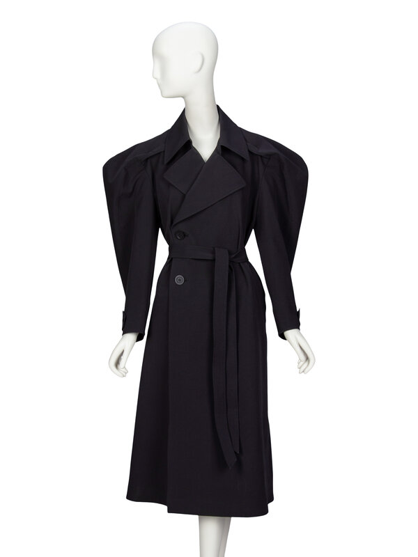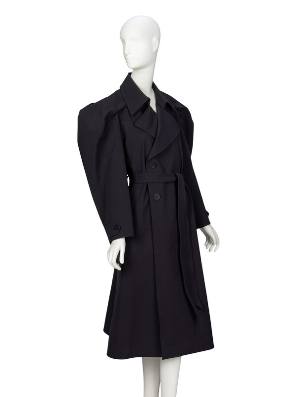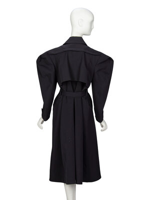 "R" trench coat in black lightweight stretch polyester taffeta. Notched lapels. Storm flap at upper back. Full-length sleeves with large sculptural shoulder and buttoned tabs at cuffs. Two welt pockets at front. Belt loops at waist with detached self-fabric belt. Double breasted; two exterior button closures. Knee-length. Unlined.