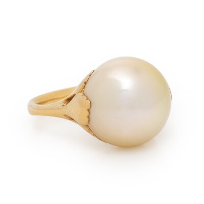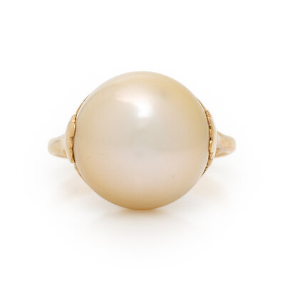 Cultured golden pearl measuring approximately 14.00 mm (origin of color not tested) and round diamonds. 18 karat yellow gold. Ring size 6 3/4.