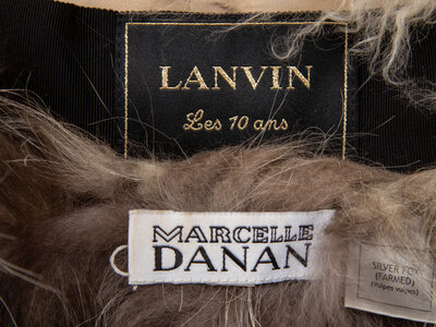 Cropped shrug in silver fox fur. Wide collarless neckline. Open front. Short sleeves. Curved front panels. Unlined.