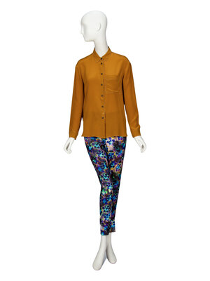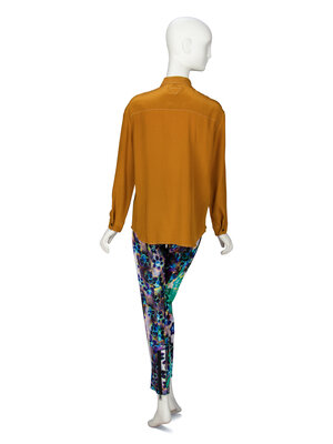 Button-up blouse in ochre silk crêpe de chine. Standard shirt collar. Full-length sleeves with buttoned shirt cuffs. Patch pocket at upper chest. Triangle applique at back neck. Button closures at front. Unlined.