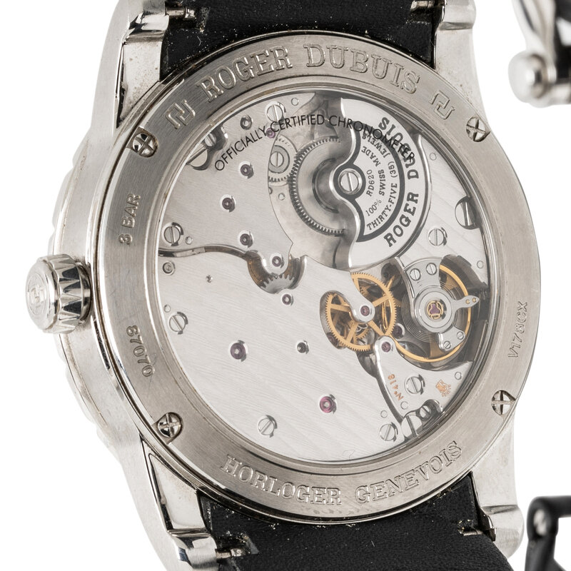 Stamps: Case: ROGER DUBUIS 3 BAR 87070 HORLOGER GENEVOIS V178CX. Strap: ROGER DUBUIS CEX12SID. Clasp: ROGER DUBUIS.