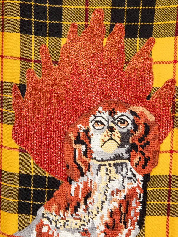 Midi-length kilt skirt in yellow & black Macleod wool tartan. Features cross-stitched dog & beaded flame appliques at front. Pleating throughout. Buckled black leather straps near waist. Invisible zipper closure at side waist. Unlined.