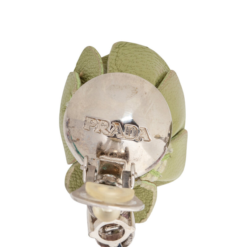 Drop ear clips in silver-tone metal with green leather rosettes and pink rhinestone settings. Standard ear clip backings.