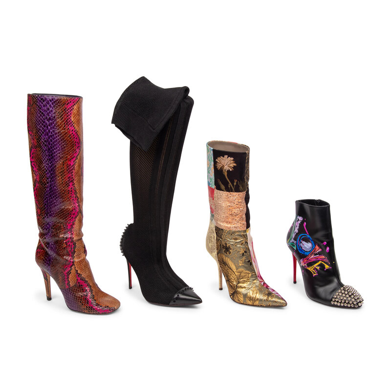 Mid-calf heeled boots in a multicolor patchwork textile. Stiletto heel & pointed toe boxes. No closures.