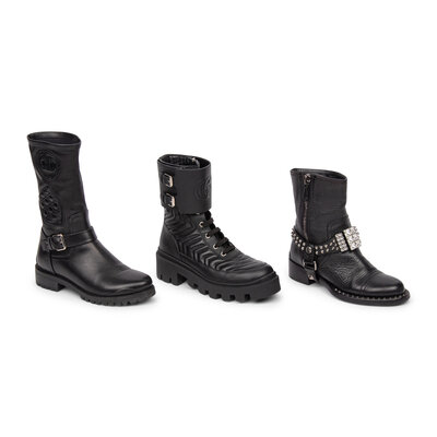 Moto-style boots in grained black leather with silver-tone hardware and metal stud & rhinestone embellishments. With removable embellished buckled straps. Zipper closures at interior ankles.