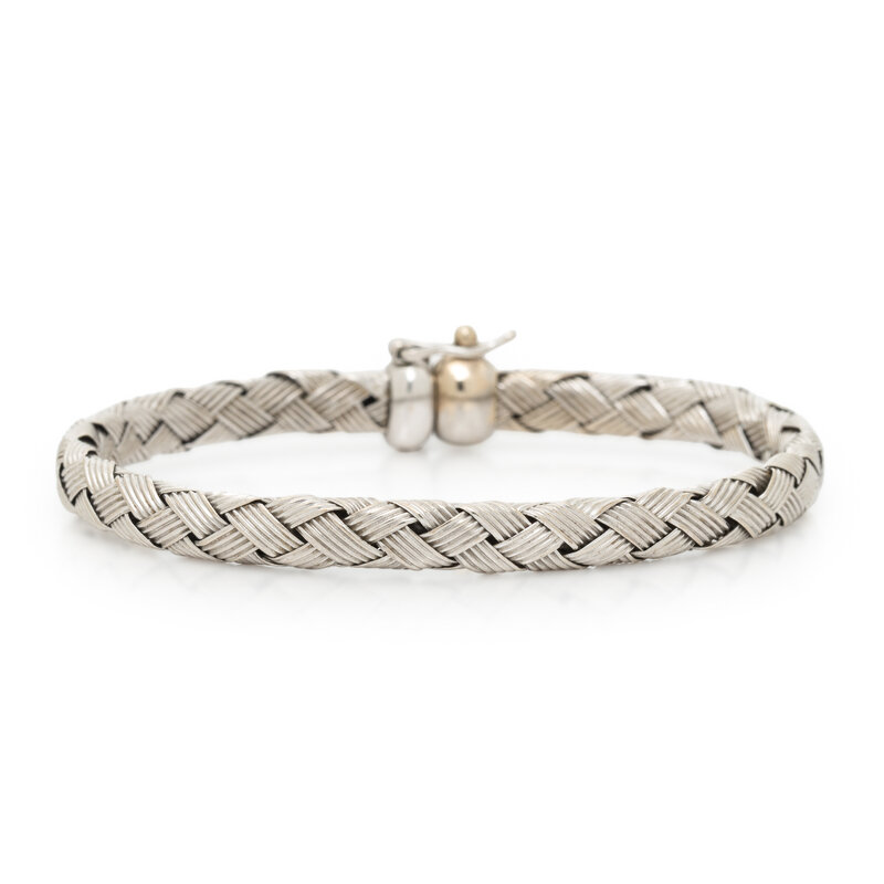 Semi-flexible with clasp. White gold. 5 1/2 inches inner circumference.