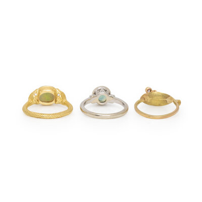 Including three rings, one set with oval cabochon opal measuring approximately 8.25 x 5.75 mm and round diamonds, one set with round diamonds, and one set with a round tourmaline measuring approximately 7.00 x 7.00 x 4.20 mm and round diamonds. 18 karat yellow gold, yellow gold, and low-karat white gold. Ring sizes 6 1/2, 6 1/4, and 6 3/4.