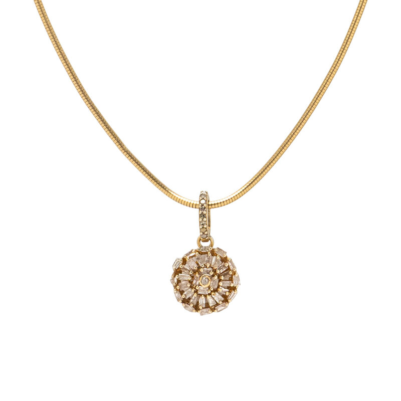 Round and baguette cut diamonds weighing approximately 1.20 carats total. 18 karat yellow gold and sterling silver. Chain: 18 inches long. Pendant: 7/8 inches long.