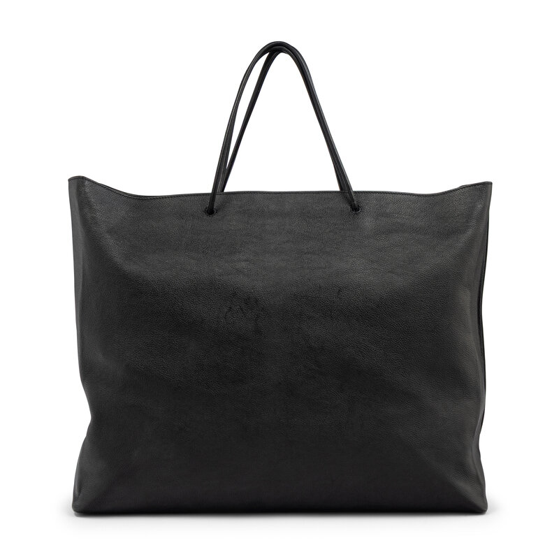 XL Shopping Tote bag in black grained leather with a white printed logo at front. Double ended zipper closure and rolled leather handles.