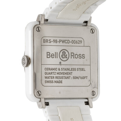 Stamps: Case: BRS-98-PWCD-00629 Bell & Ross CERAMIC & STAINLESS STEEL QUARTZ MOVEMENT WATER RESISTANT 50M/160FT SWISS MADE. Bracelet: Bell & Ross. Clasp: STAINLESS STEEL.