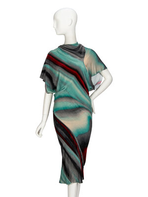 Asymmetrically draped dress in multicolor viscose/silk-blend velvet. Cowl neckline. Short draped flutter sleeves. Spiral seam around body; partially bias cut. Knee length. No closures. Unlined.