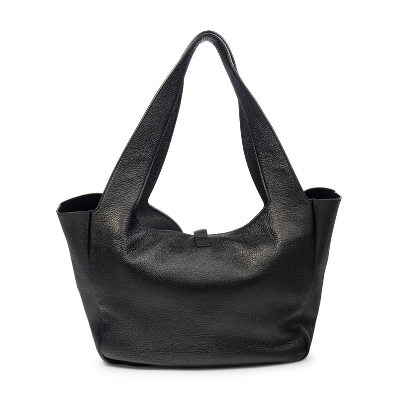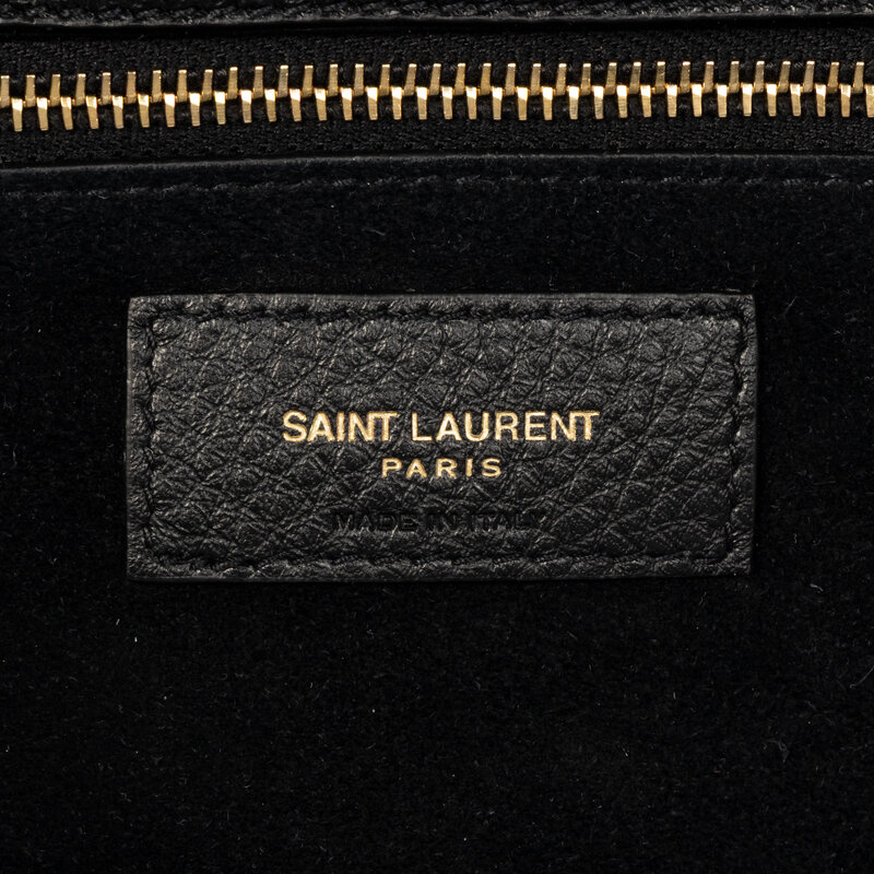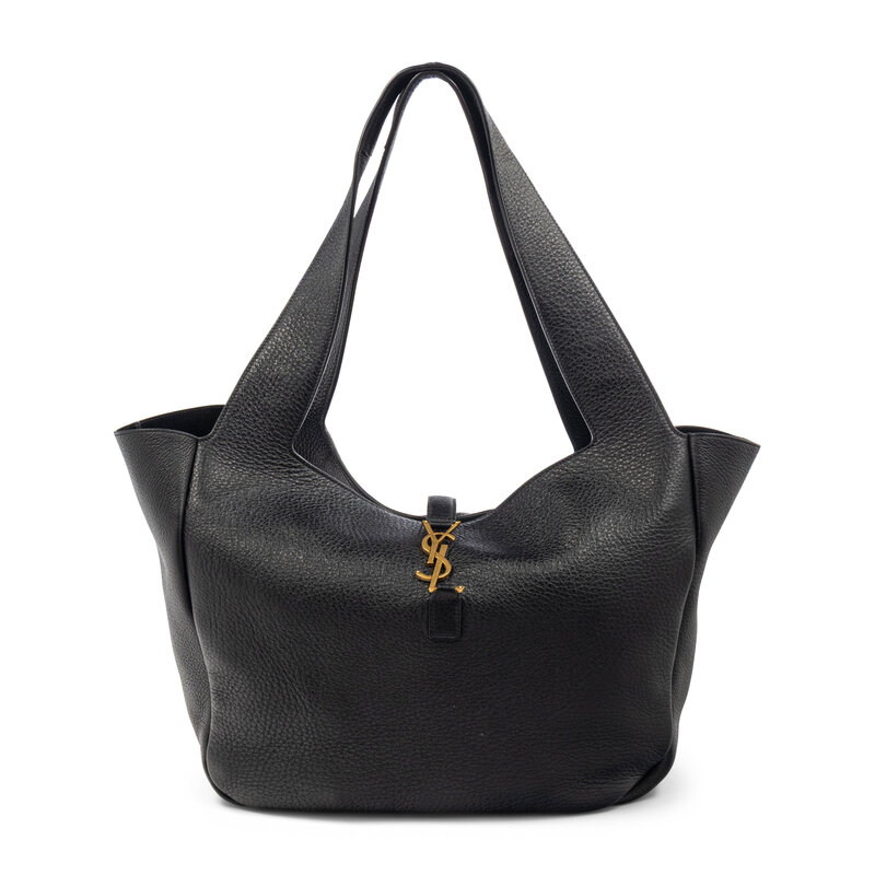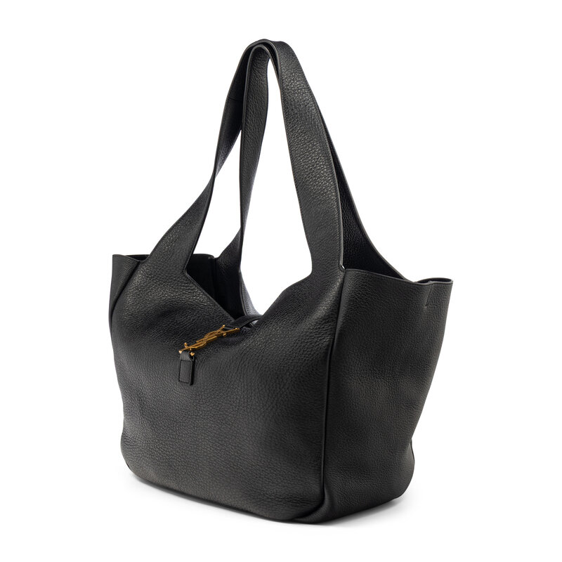 Medium "Sac Le 5a7" shopping tote bag in black grained leather. YSL top latch & loop closure and incorporated flat leather straps.