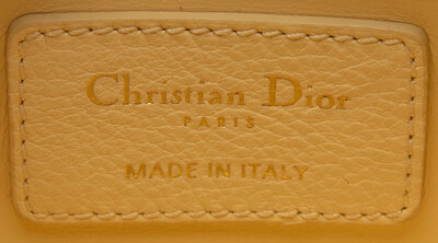 Mini DiorAddict flap bag in butter yellow cannage-quilted leather with gold-tone hardware. Turn-lock closure and adjustable metal chain & leather strap.