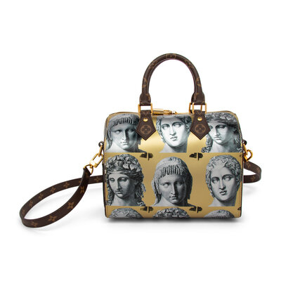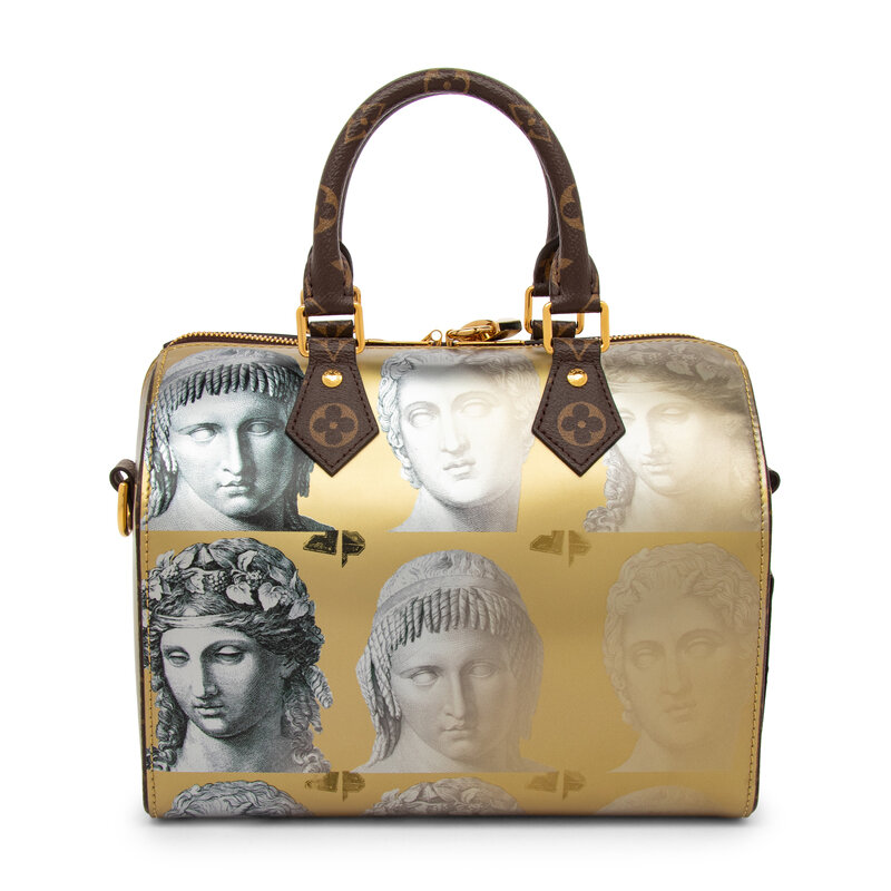 Speedy Bandoulière 25 bag in metallic gold leather printed with illustrated marble busts & monogram coated canvas trim. Locking double zipper closure; rolled canvas handles and removable flat canvas strap.